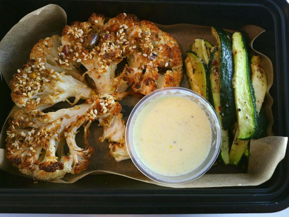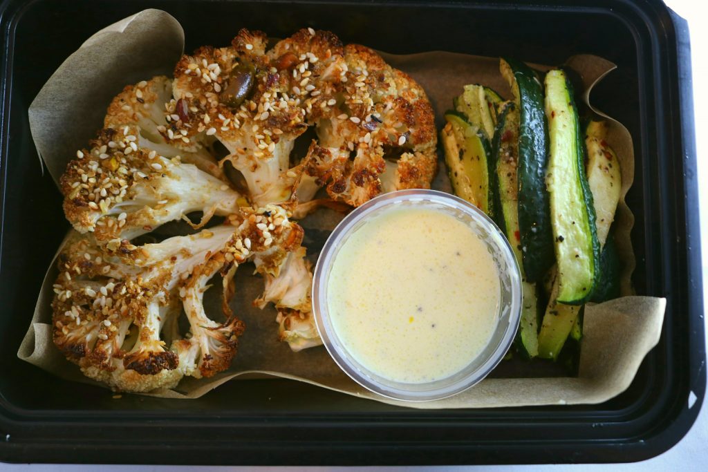 Dukkha Spice Crusted Cauliflower “Steak” with Baked Sumac Zucchini “Fries” and Dairy-Free Preserved Lemon Sauce