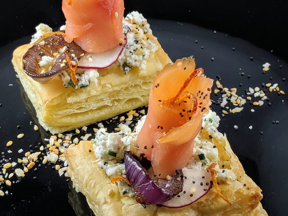 Smoked Salmon, Herbed Goat Cheese, Caramelized Onion, Blood Orange Zest, and Everything Bagel Blend on Puff Pastry