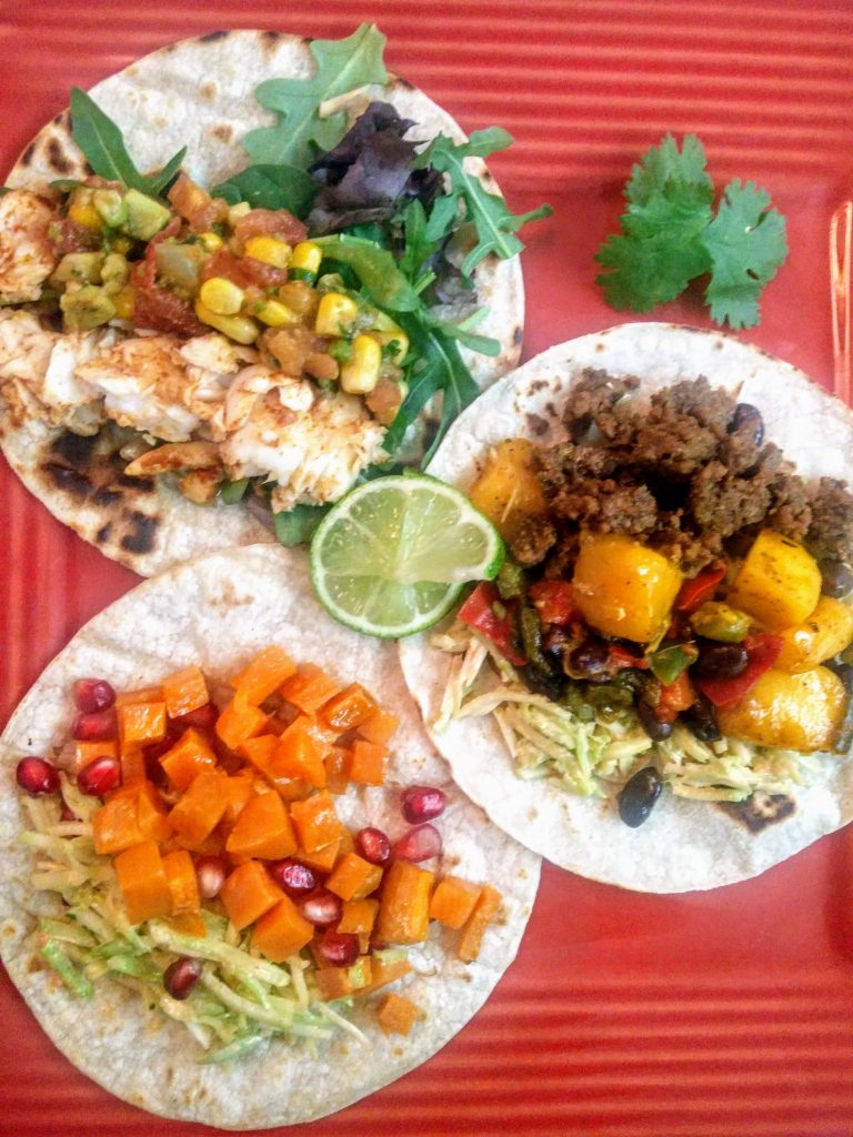 Fish Taco, MorningStar Farm Grillers® Crumbles™ Taco, Sweet Potato and Pomegranate Taco