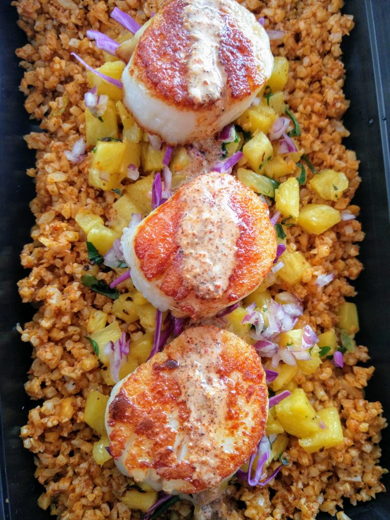 Seared Scallops with Coconut Caribbean Curry, Jamaican Fried Cauliflower “Rice”, and Pineapple Salsa