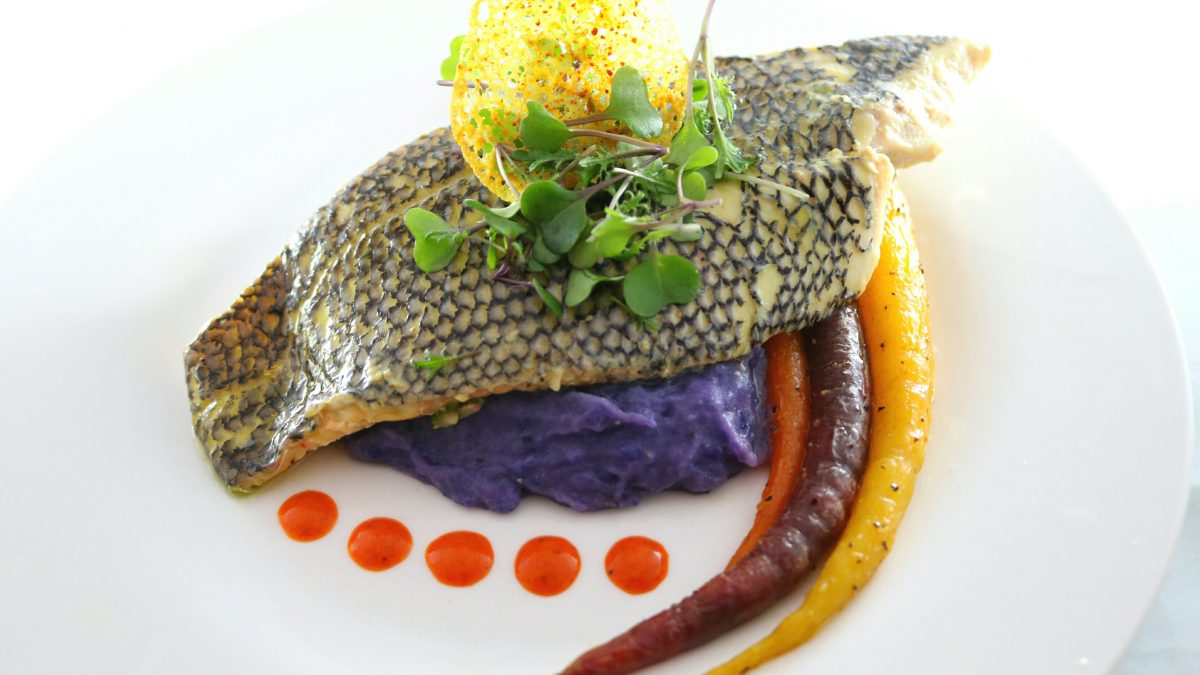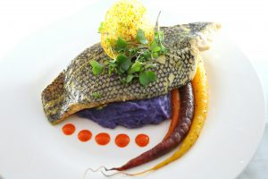 Sous Vide Chilean Sea Bass with Saffron Butter, Ras el Hanout and Orange Roasted Carrots, Goat Cheese Whipped Purple Potatoes, Roasted Red Pepper Aioli,and Piment d’Espelette Tuile
