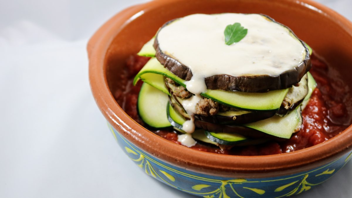 Roasted Eggplant with Ground Beef Topped with a Truffle Cashew Cream Sauce.