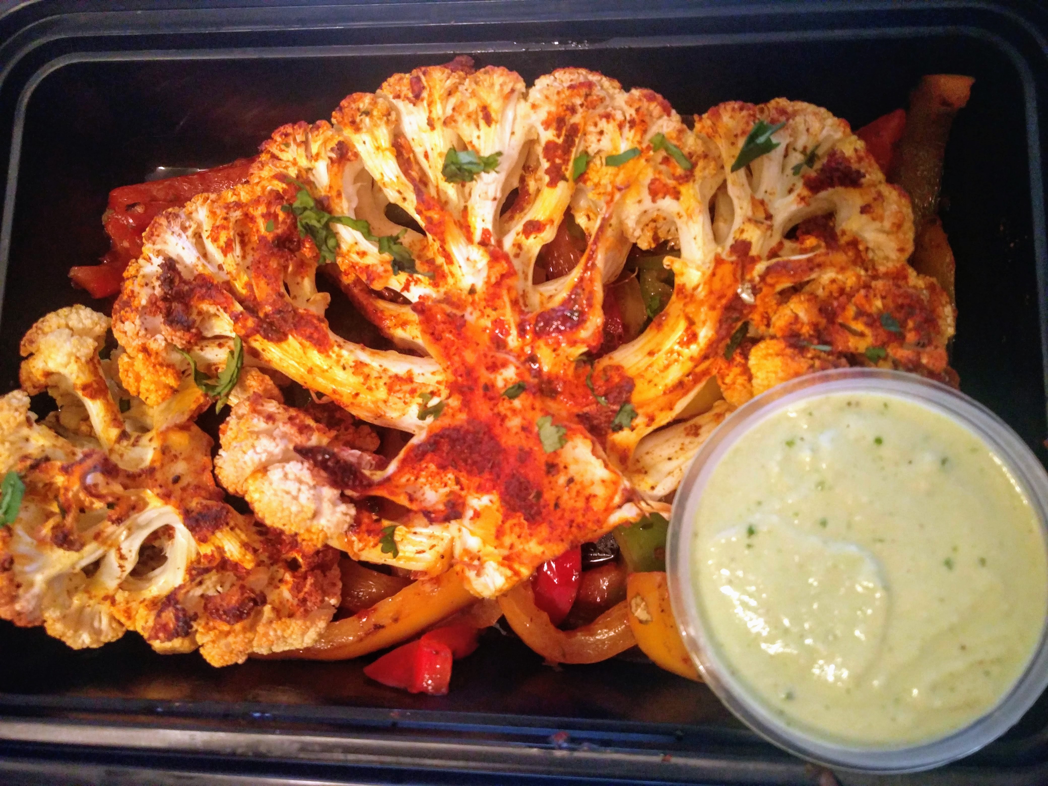 Fajita Cauliflower “Steak” with Peppers and Onions with a Creamy Lime Garlic Cashew Sauce