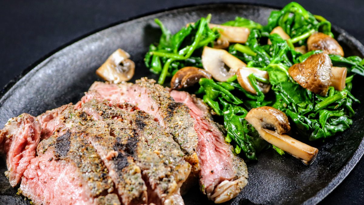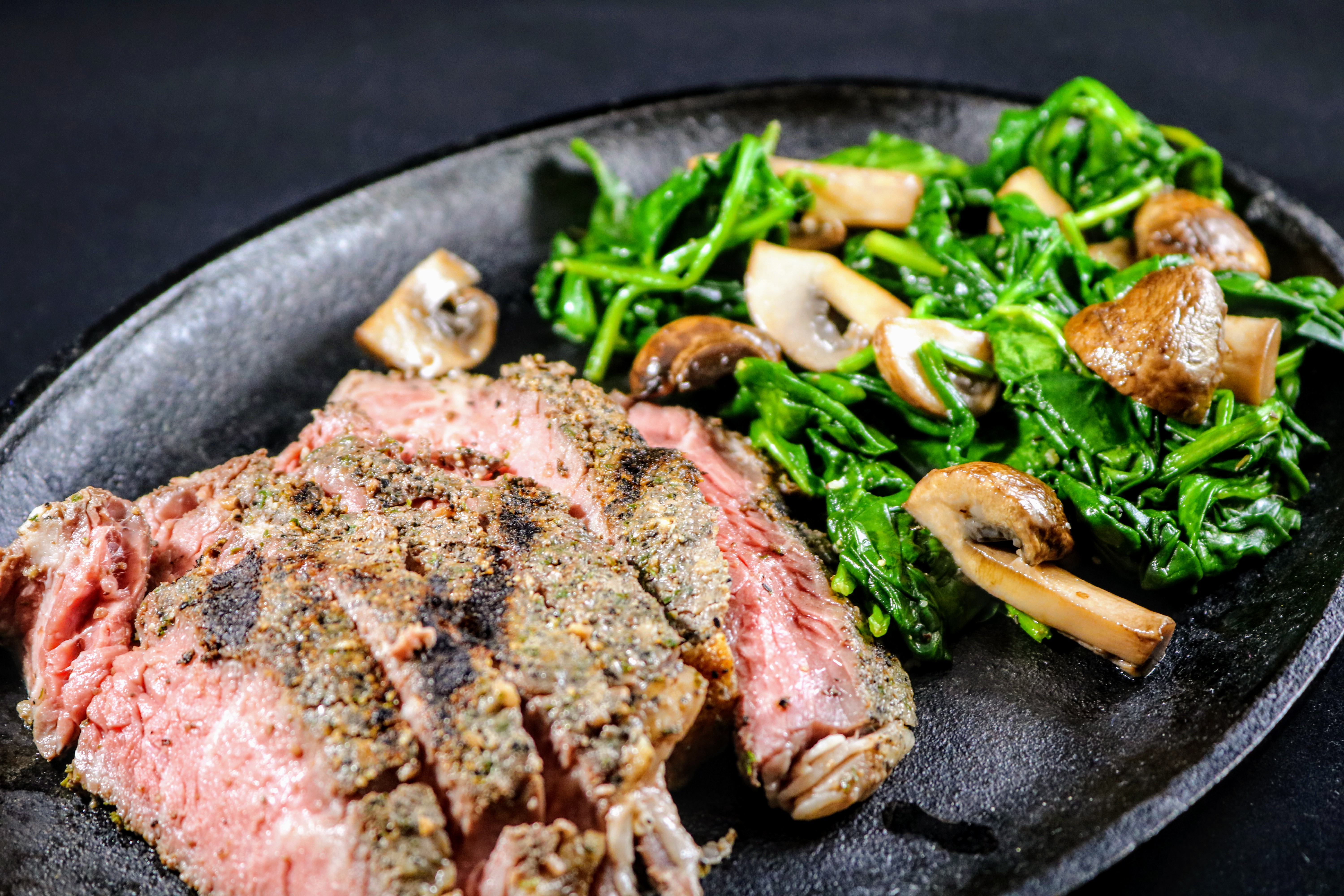 Sous Vide Flank Steak with Grey Sea Salt, Garlic, and Parsley with Sautéed Spinach and Mushrooms