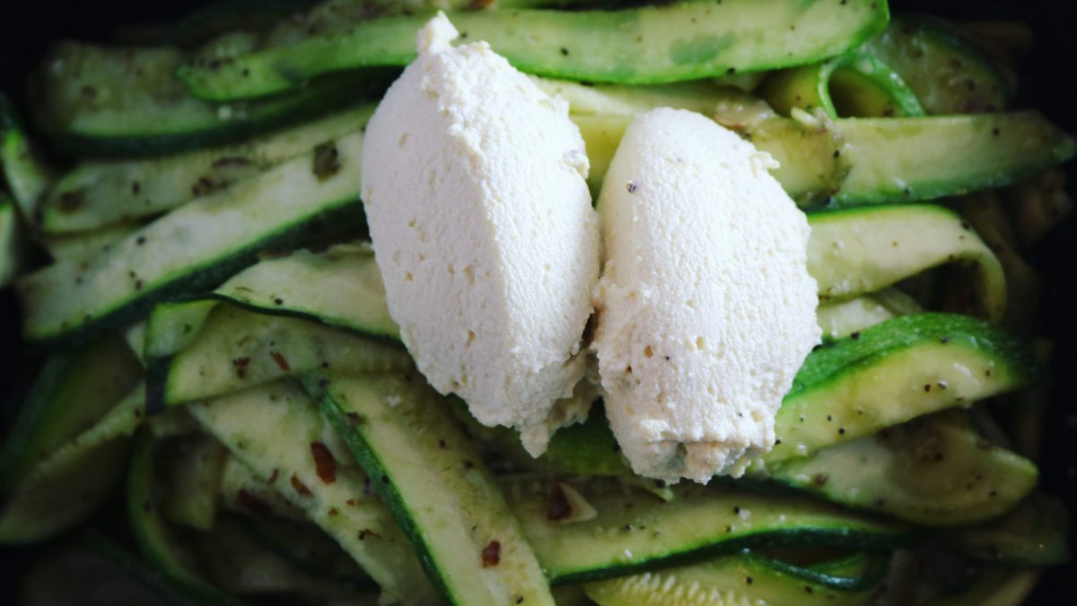 Zucchini Ribbons Sautéed in Avocado-Almond Sauce Topped with Truffle Tofu “Ricotta”.