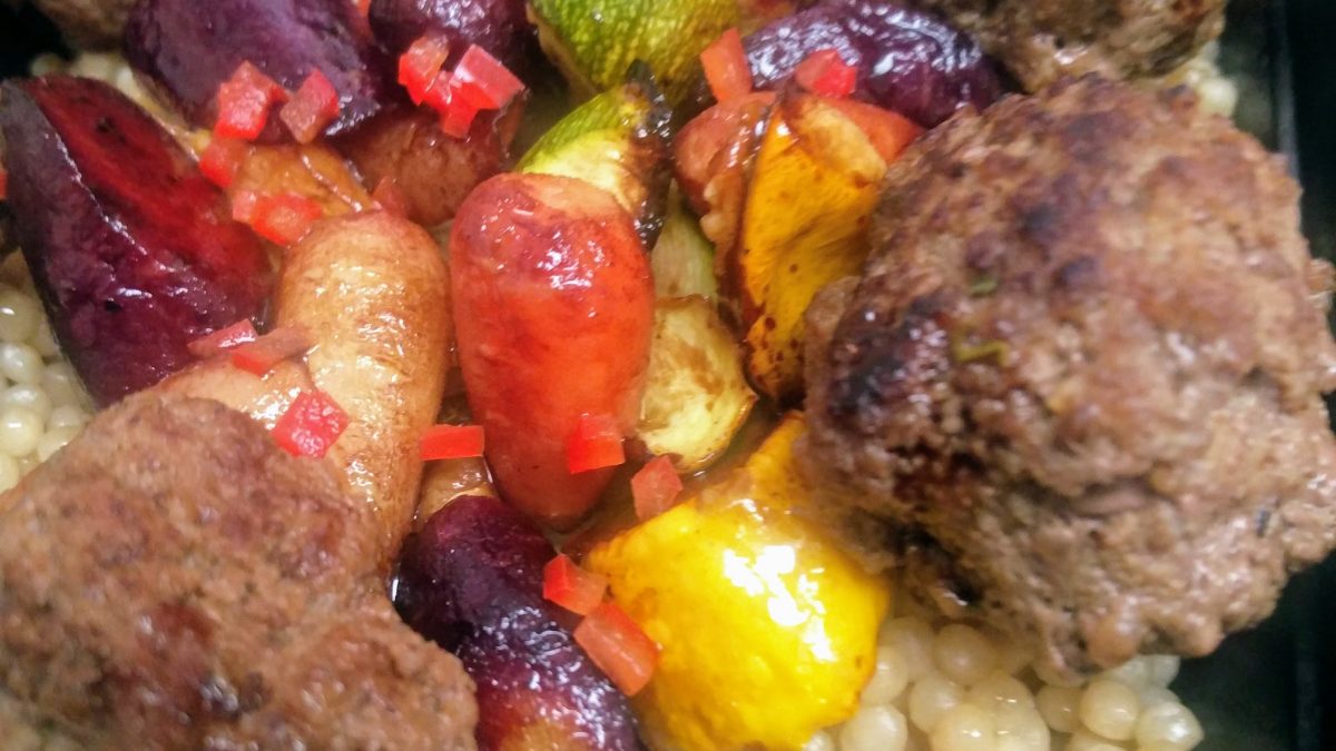 Moroccan Lamb Meatballs with Braised Vegetables, Pomegranate Molasses, and Couscous