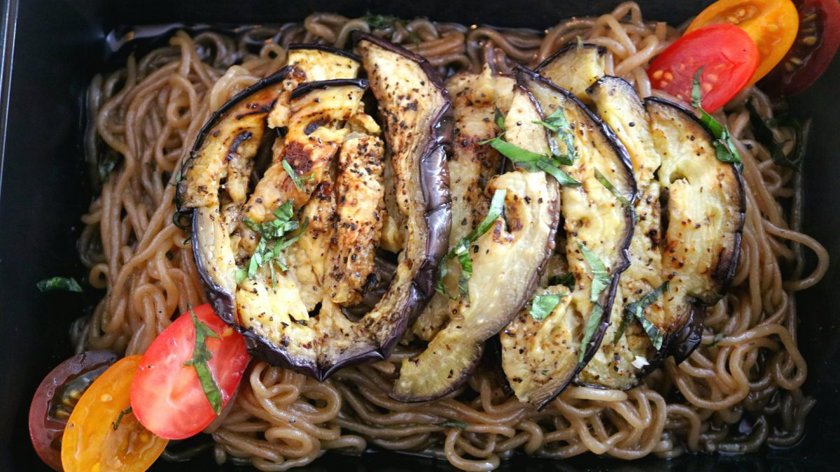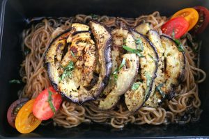 Roasted Eggplant with Truffle Balsamic Noodles and Tomatoes