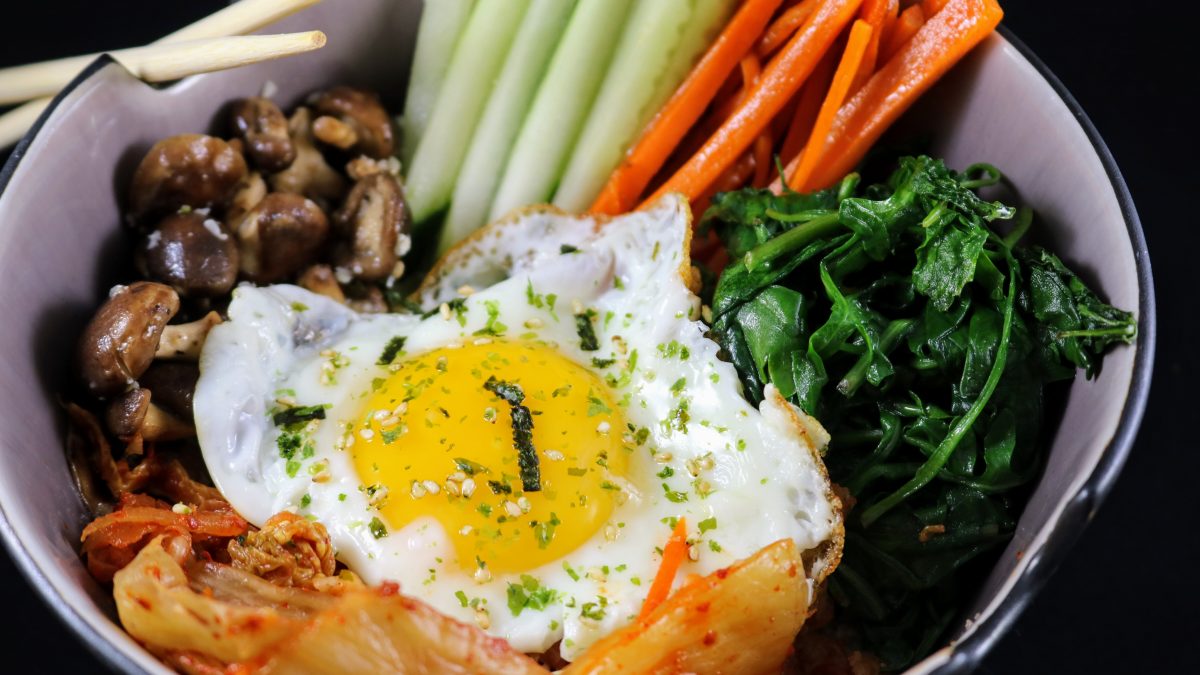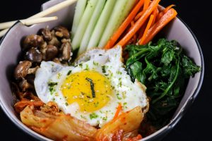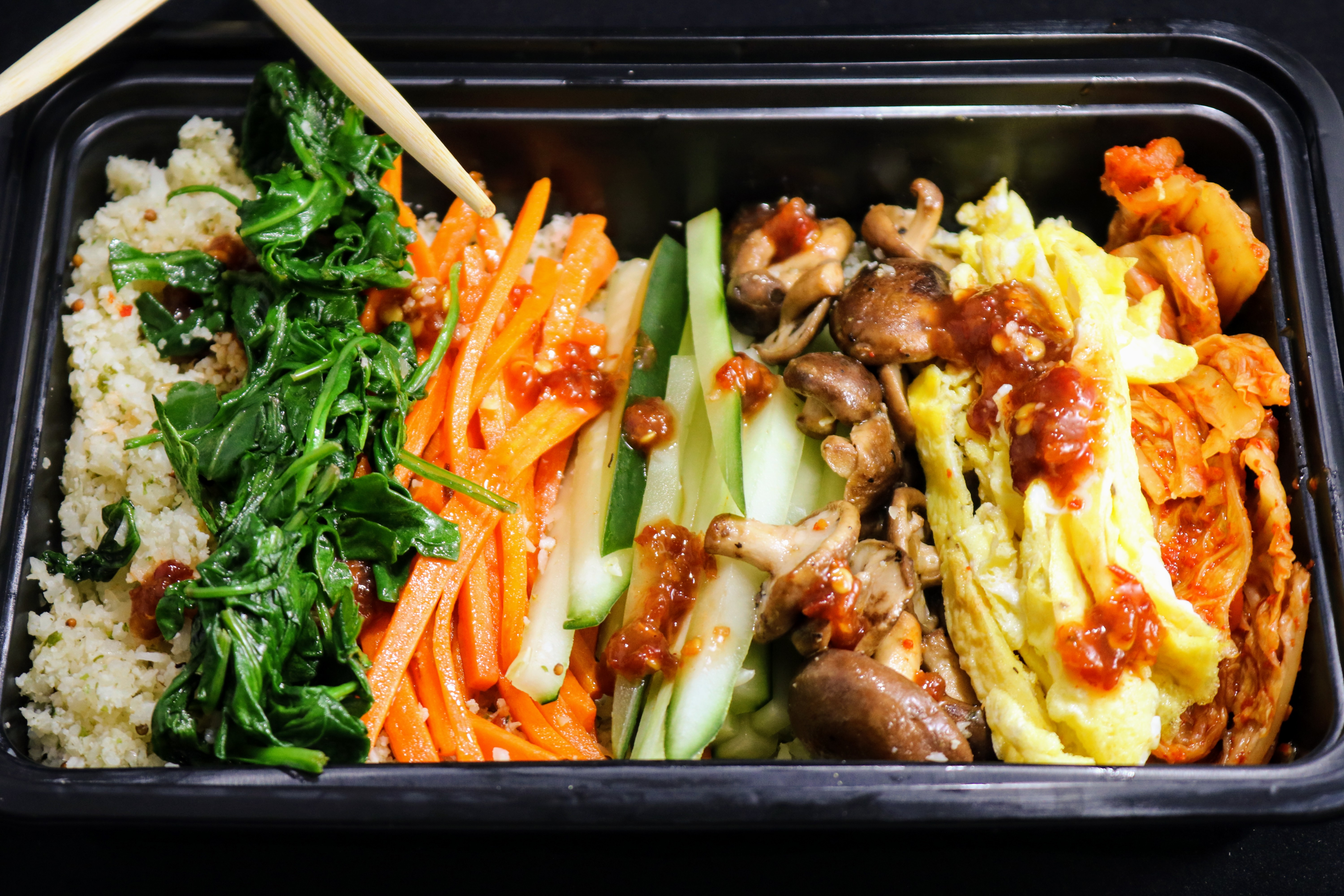 Vegetable Bibimbap (Cucumber, Carrots, Spinach, Kimchi, Shiitake Mushroom, Egg and Asian Season Cauliflower “Rice”
